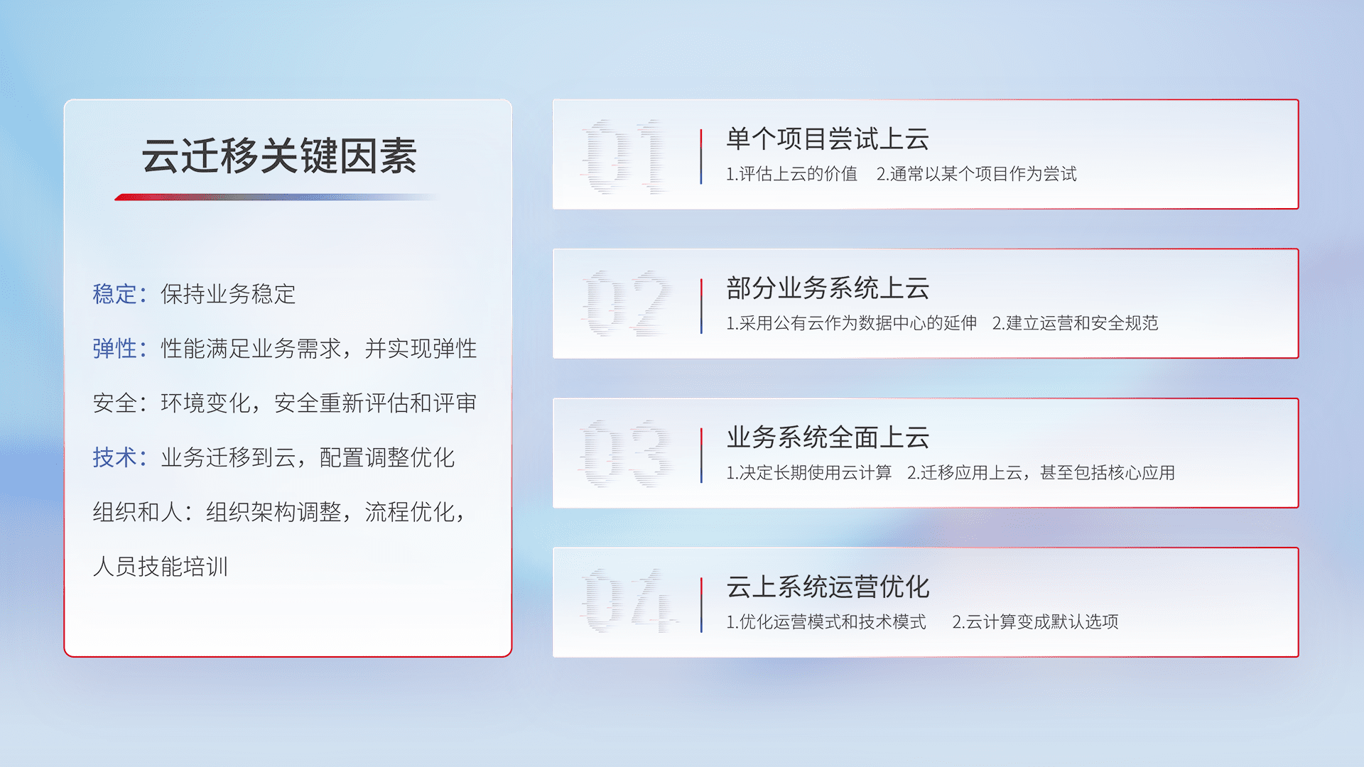 结合实际业务,,从规划设计、、、、云平台选型、、云原生改造、、、数据迁移、、、、集成交付,,,,迁移全过程为客户识别最佳上云路径,,做好风险识别管理,,设计网络架构、、身份权限、、、安全审计合规、、操作审计、、日志审计、、、、监控告警策略、、、、多站点容灾设计等,,,,对云上基础设施进行整体规划,,,,提升IT治理水平,,以满足弹性、、高可用、、、高性能的需求。。